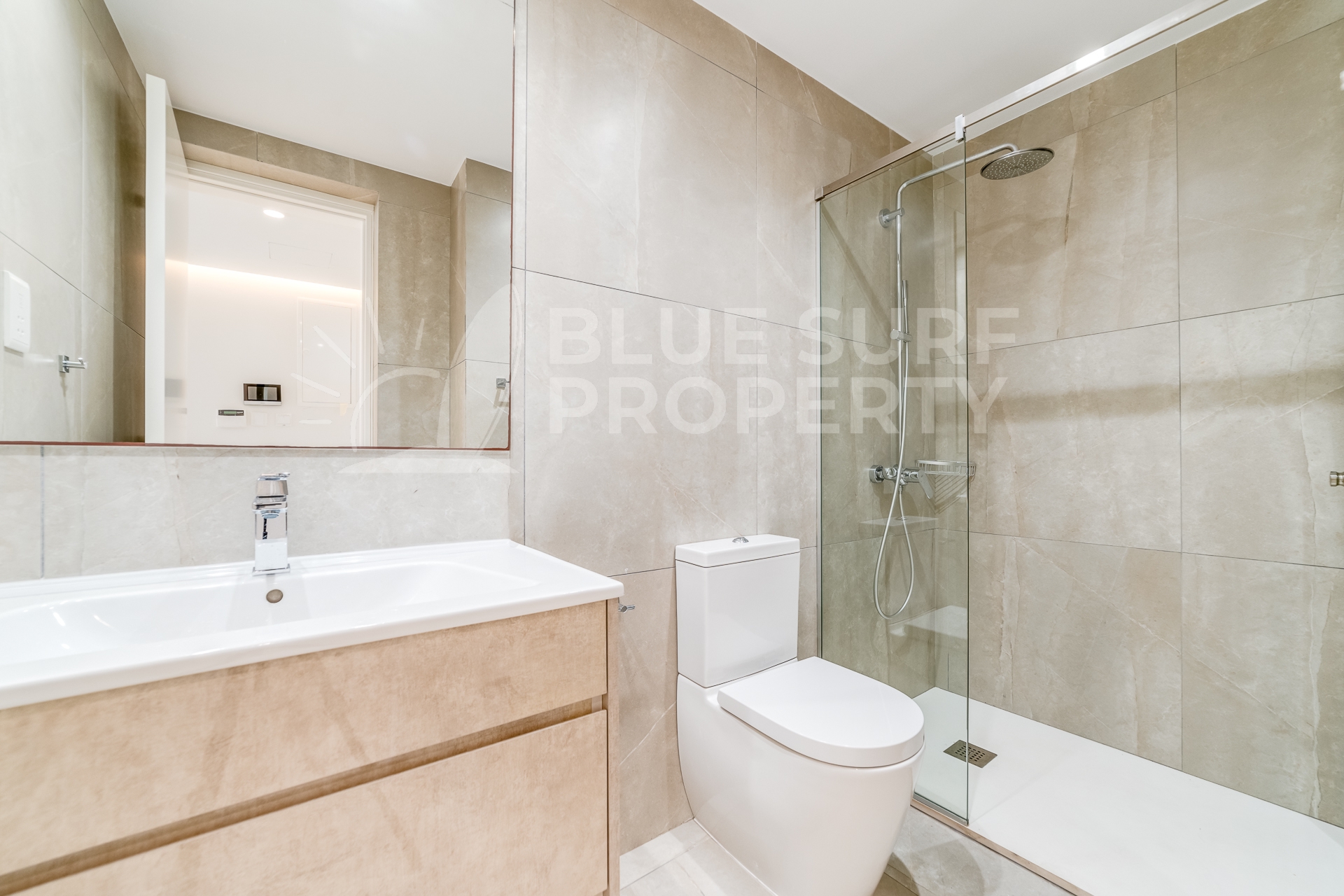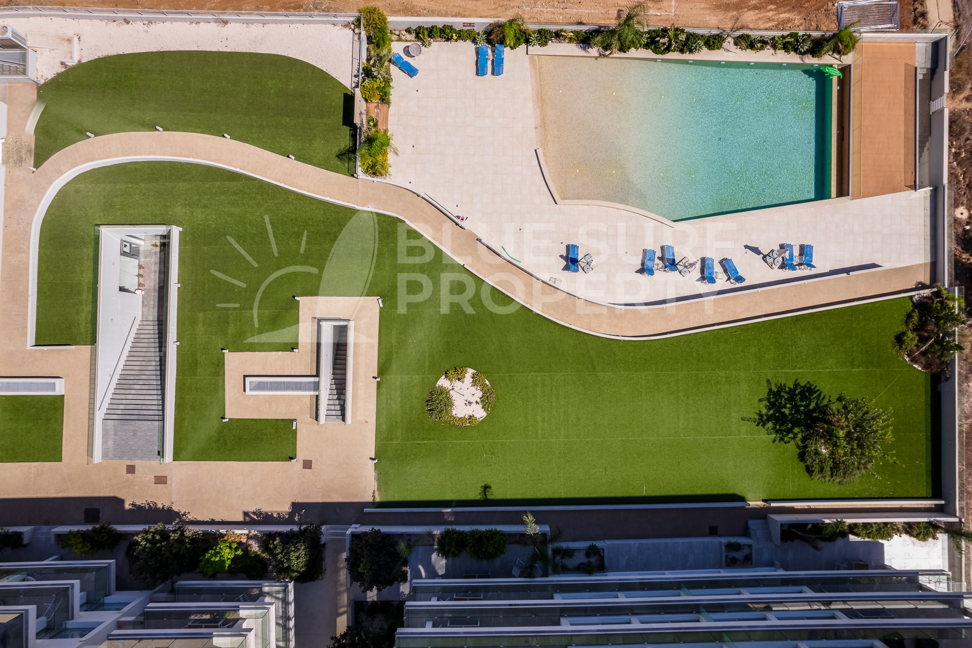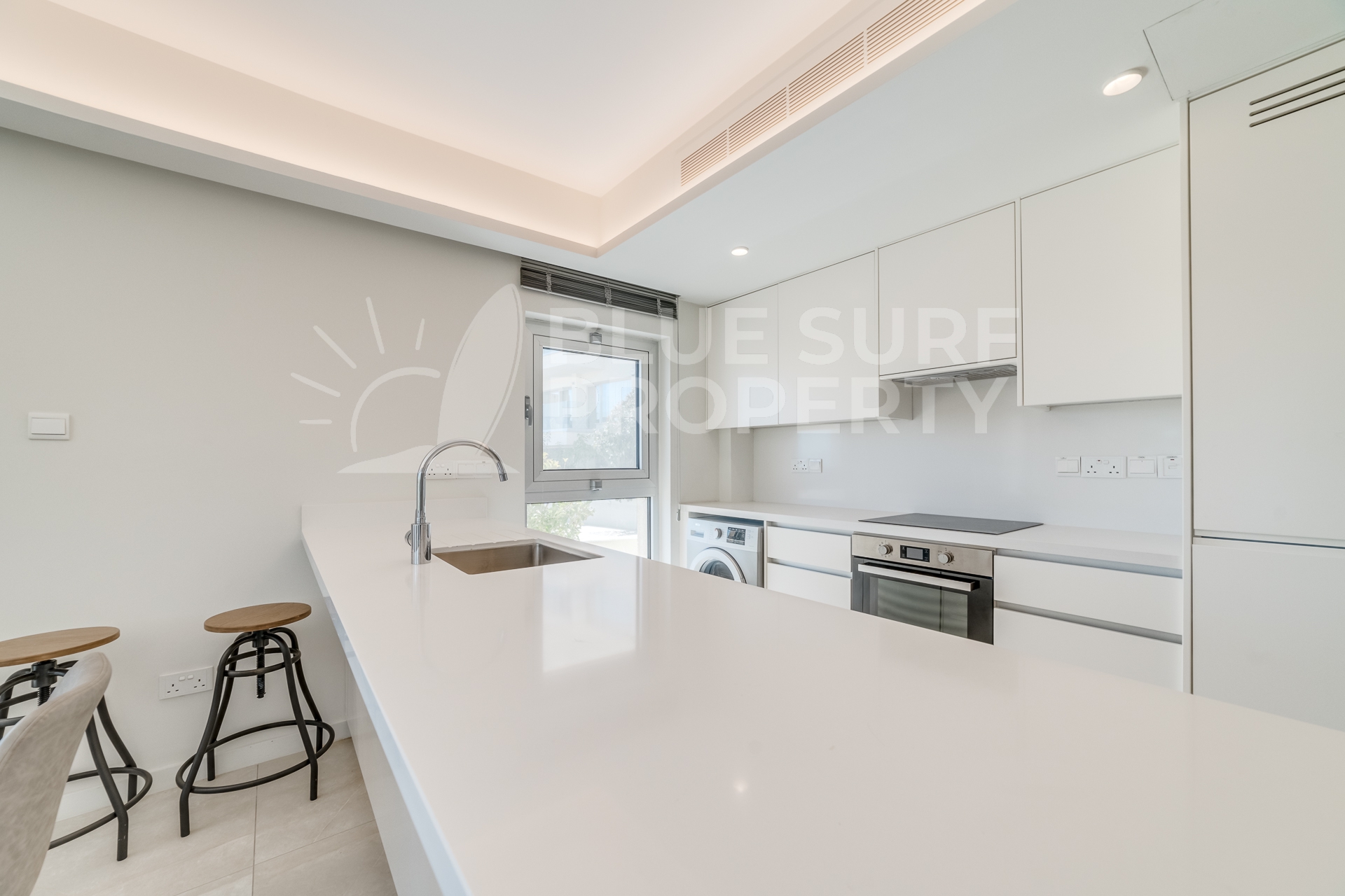This beautifully designed apartment offers a blend of modern luxury and laid-back Mediterranean living, clean contemporary lines are softened by the welcoming atmosphere of a true home, creating a stylish yet liveable retreat. The expansive open-plan living and dining area is filled with an abundance of natural light filtering through the large double-glazed windows and patio doors, which leads directly out onto the part covered terrace, an ideal spot to unwind and soak in the stunning coastal views, all from the comfort of your own home. The modern fitted kitchen has a high-quality crisp white finish, with ample worktops and storage and all the latest top-quality fixtures and fittings, perfect for all your kitchen needs. There are two double bedrooms the master boasting an en suite with shower unit, both bedrooms designed to a high standard with floor to ceiling fitted wardrobes, plus there is a fully tiled family bathroom kitted out with a walk-in shower unit.